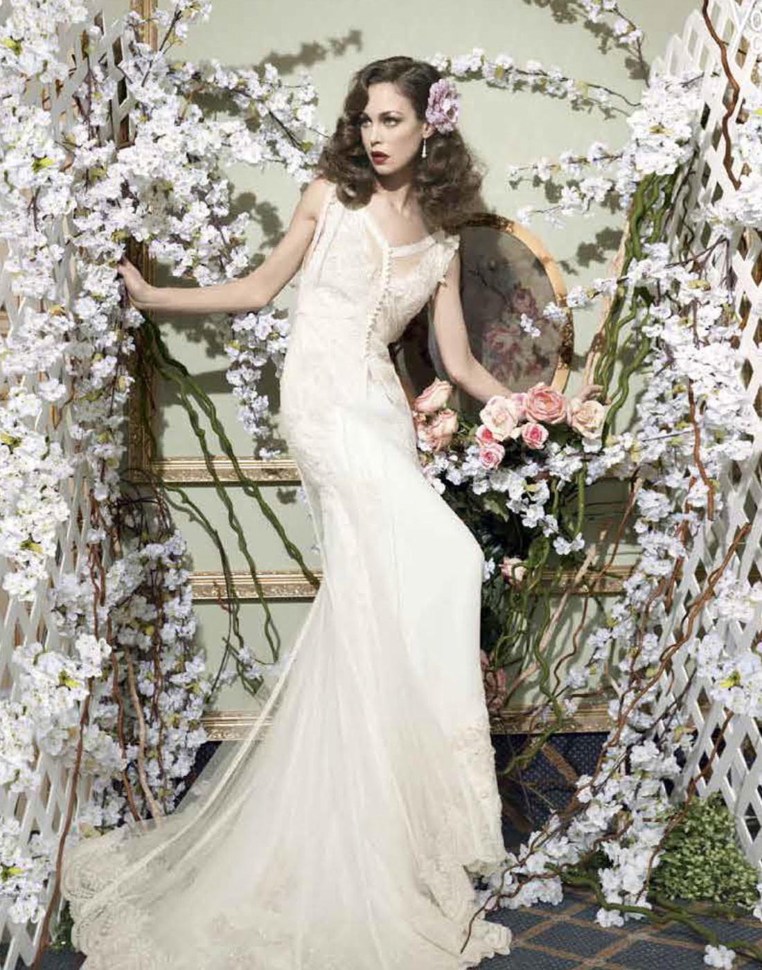 繊細な素材がボディラインを優しく包む、ナチュラルな女性らしさが引き立つ優美なスレンダーライン。 透明感のあるレースやくるみボタンが、デコルテにロマンティックな華やぎをプラスした、ヴィンテージライクなドレスです。 ふんわりと風をはらむスカートが、花嫁の神秘的な魅力を漂わせます。ほど良い甘さが、洗練された大人の雰囲気を演出し、ムーディーなナイトウェディングにも映える一着です。